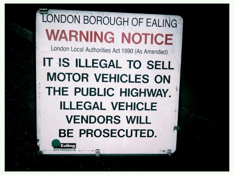 Il cartello dice "E' illegale vendere veicoli a motore sulla pubblica via. I venditori illegali di veicoli verranno perseguiti". Il cartello e' in un'area residenziale lungo la strada principale di Ealing, vicino a Londra, in un'area in cui non c'e' nessun negozio di auto. E nonostante non ci siano negozi d'auto, io ero li', ieri, dopo aver letto di un'Audi diesel automatica in vendita presso un autosalone che avrebbe dovuto essere li'. Conclusione ovvia: qualcuno mette annunci online (quello che ho letto era su AutoTrader.co.uk) spacciandosi per un venditore d'auto professionista pur senza averne il diritto. Quindi niente assistenza postvendita, nessuna garanzia, nessuna struttura, solo un tizio con un computer e un'auto da vendere (ottenuta chissa' come). In breve, una buona probabilita' di venir presi per il naso.